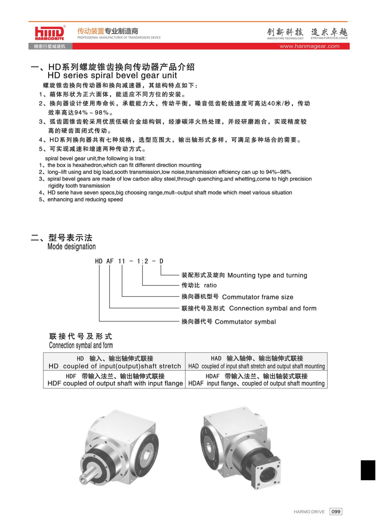 简 介:产品特点:1、HD系列,设计使用寿命长,承载能力大,传动平稳,噪音低齿轮线速度可高达40米/秒,传动效率高达 94%一98%;2、HD系列箱体形状为正六面体,能适应不同方位的安装;3、HD系列换向器可实现减速和增速两种传动方式;4、HD系列换向器共有七种规格,选型范围大,输出轴形式多样,可满足多种场合的需要;5、弧齿圆锥齿轮采用低碳合金结构钢,经渗碳淬火热处理,并经研磨跑合,实现精度较高的硬齿面闭式传动。 //HD型号:HD09 / HD11 / HD14 / HD17 / HD21 / HD24 / HD28 //HDA09 / HDA11 / HDA14 / HDA17 / HDA21 / HDA24 / HDA28